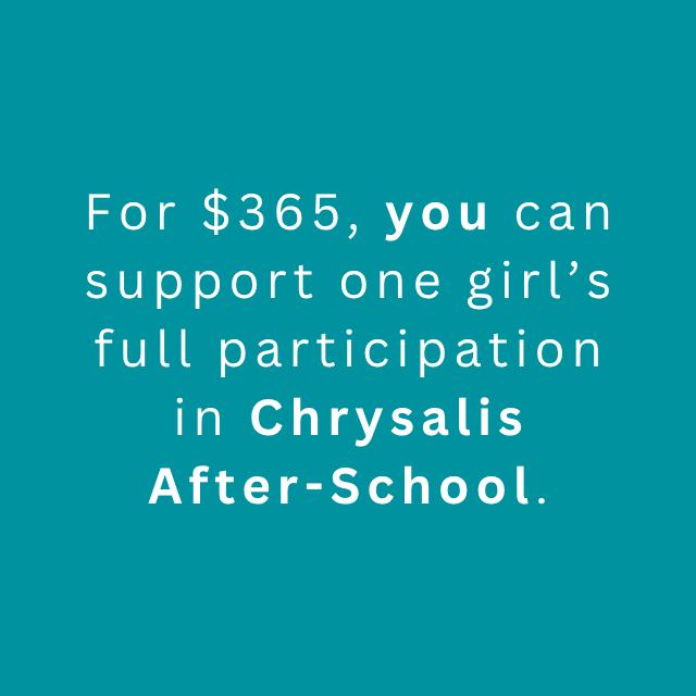 The overwhelming success of Chrysalis After-School, now involving over 800 local girls and young women in 30 school sites, can be attributed to its remarkable and life-changing results. Our investment in curriculum development, training, supplies, activities, and evaluation has been made possible by friends like you - your investment of $1 a day - $365 – supports an entire year of participation for a Chrysalis After-School participant.