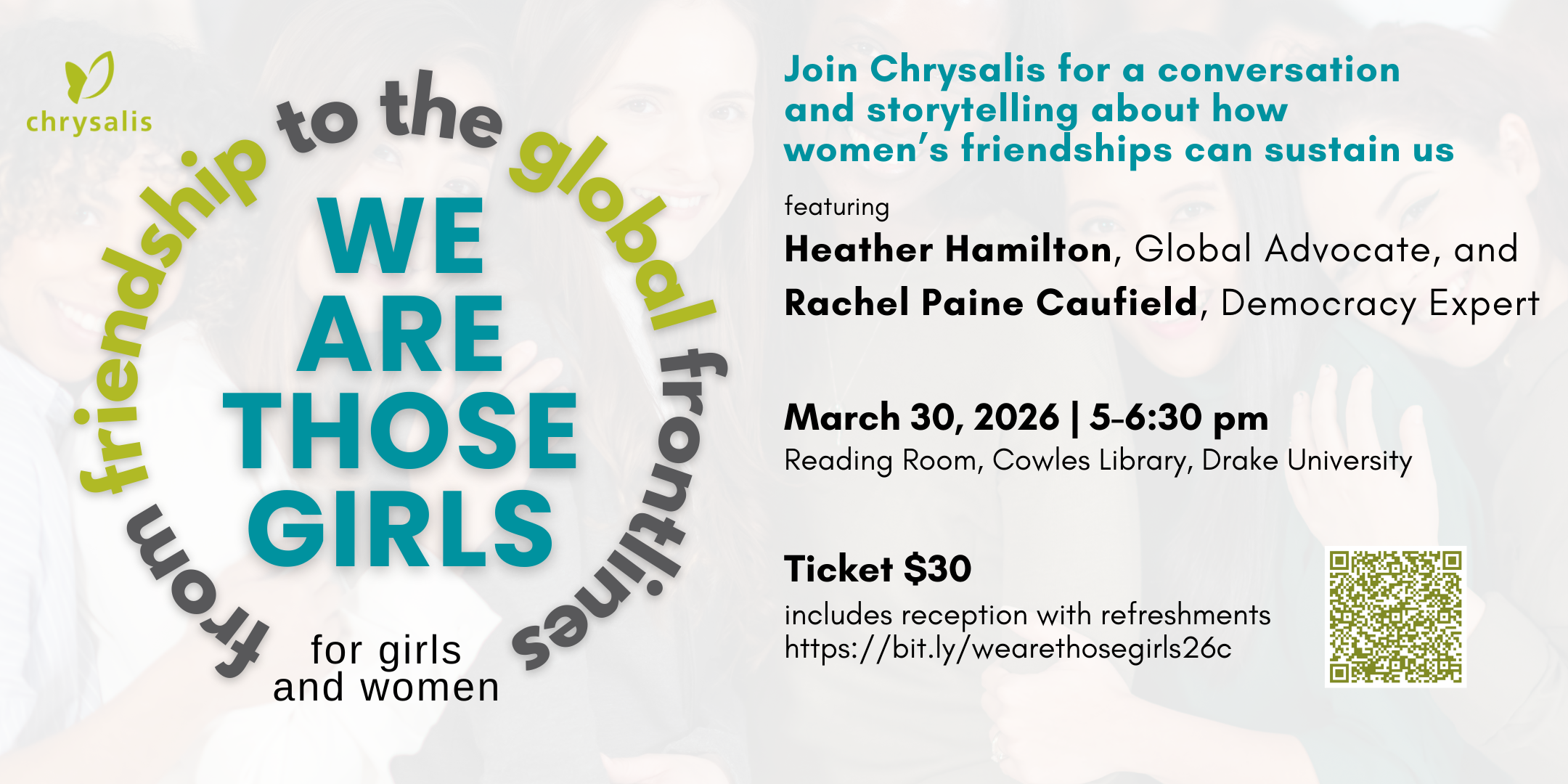 Heather Hamilton’s story began in the hills of rural Maryland as a girl who was told she was “too much” — too smart, too opinionated, too talkative, too eager. In college, she developed a life-long friendship with Rachel Paine Caufield (Drake University Professor of Political Science and Chrysalis Board President). Together, they traversed the social pressures of being young women, becoming adults, finding their identities, pursuing their professional goals, and always supporting and challenging each other.